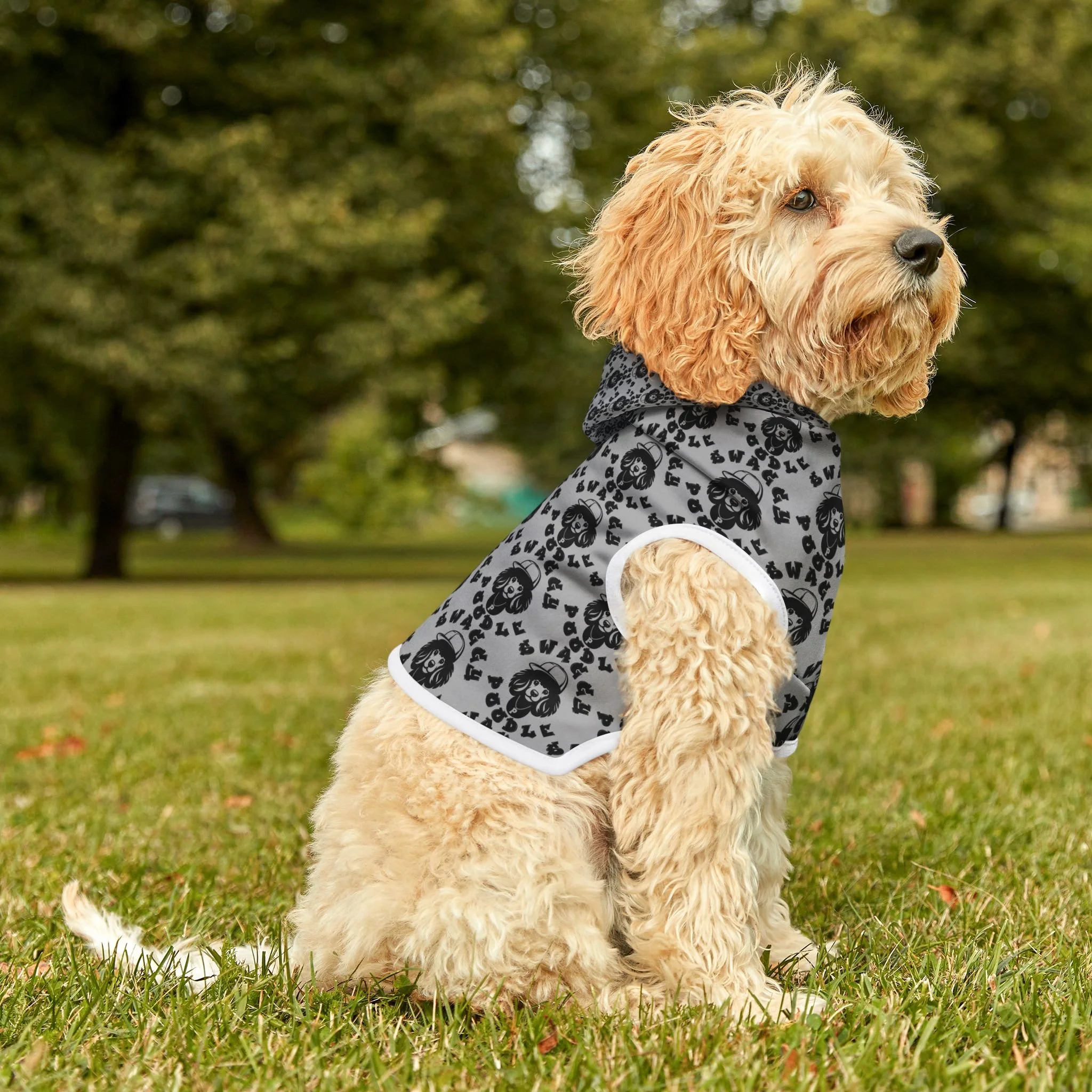 Grey Skies, Big Style — a streetwise pet hoodie that brings city attitude to your daily walks. The heather grey body wears a bold Swaggy Poodle graffiti and mascot print, while the hood flips the script with a dense micro-mascot repeat that reads like texture from a distance. Soft, resilient polyester keeps the shape and dries fast after rainy strolls. White or black rib trim and matched seam thread give a crisp, finished look. This hoodie settles into the routine of a dog who moves through sidewalks, parks, and coffee-run crowds with quiet confidence and details that reward a closer look. It drapes snugly, hides light shedding between washes, and highlights the kind of personality that prefers tone-on-tone style over loud logos.